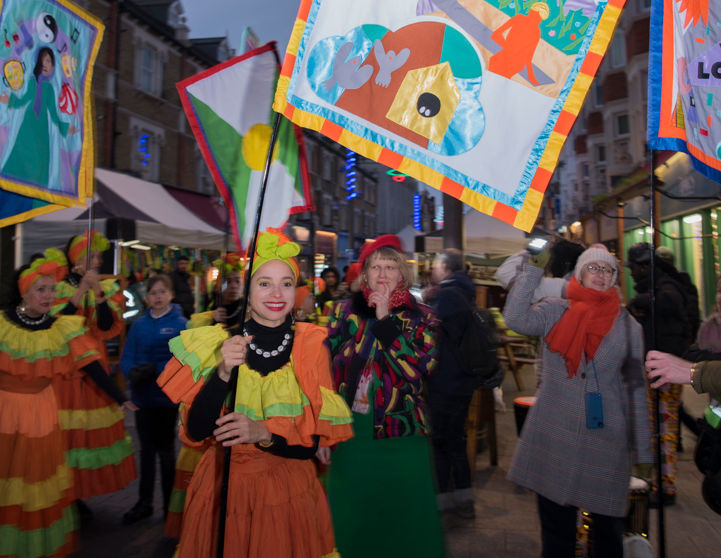 In Summer 2022 Artillery was awarded funding to create a suite of contemporary artworks inspired by the under-told stories of the people and heritage of Walthamstow High Street. In December 2022 we unveiled the major new sculpture by Sandie M Sutton flanked by a unique collection of flags co-created with artist Alisa Ruzavina, all welcomed to their High Street home with A Winter Feast of music, stories, games and delicious food to share.